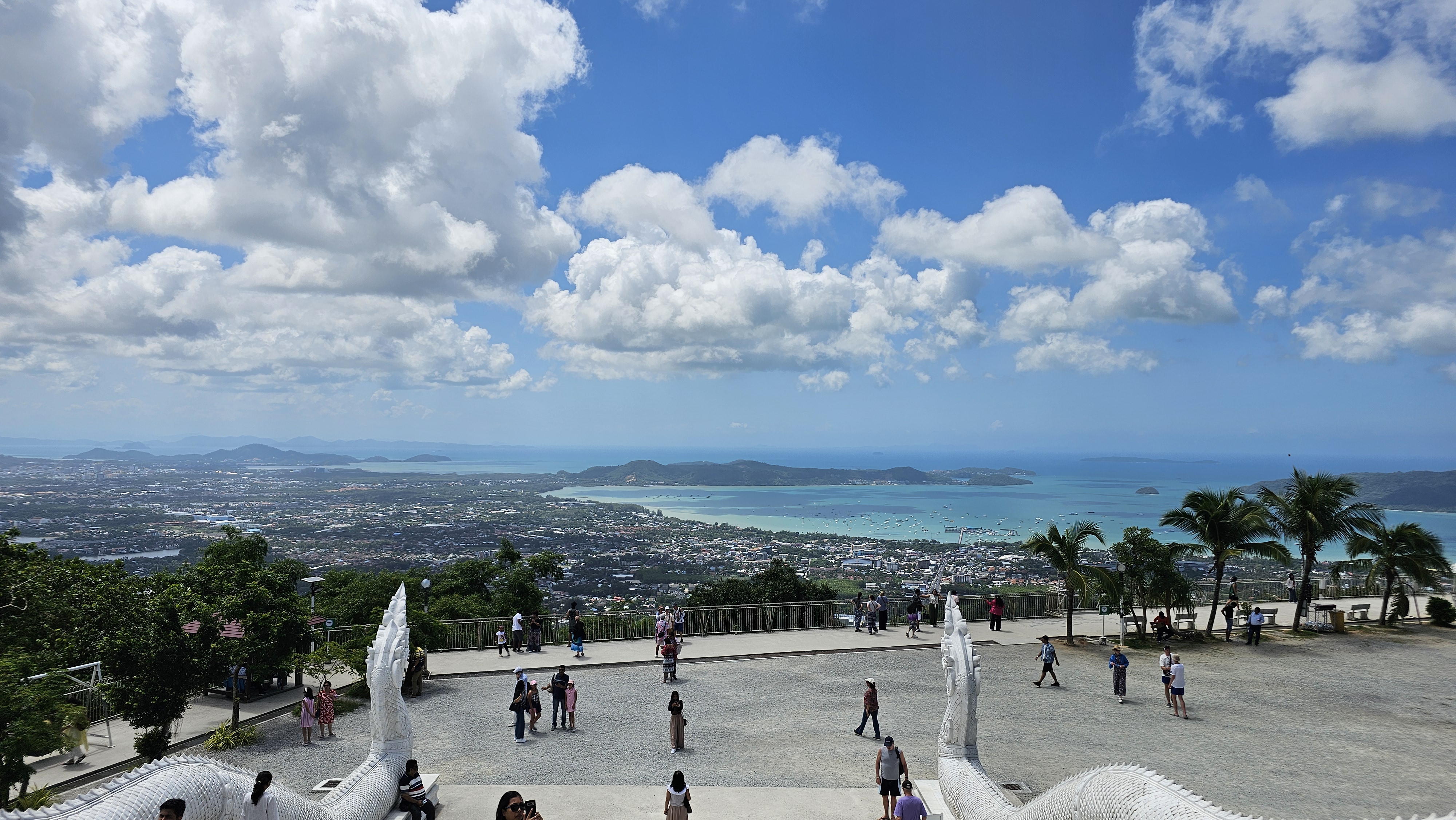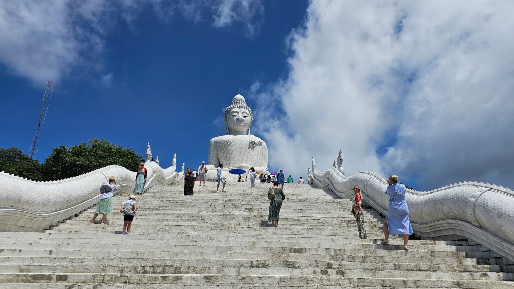Phuket is surprisingly huge, especially when you consider the diversity of its landscapes and attractions. During our visit, we were based near the airport, which made for a convenient location, but also meant that the car ride to the monument was over an hour away. However, this unexpectedly long journey turned out to be a blessing in disguise, as it gave us the opportunity to enjoy a lovely drive through the picturesque Thai countryside, passing by charming villages and stunning beaches along the way. As you take the final winding ascent up to the impressive statue, the hillside unfolds before you, dotted with several quaint cafes perched over the lush forest below. The atmosphere is serene and inviting, and if you’re feeling adventurous, it’s well worth stopping by for a quick rest and a refreshing beverage, while taking in the breathtaking views that surround you.