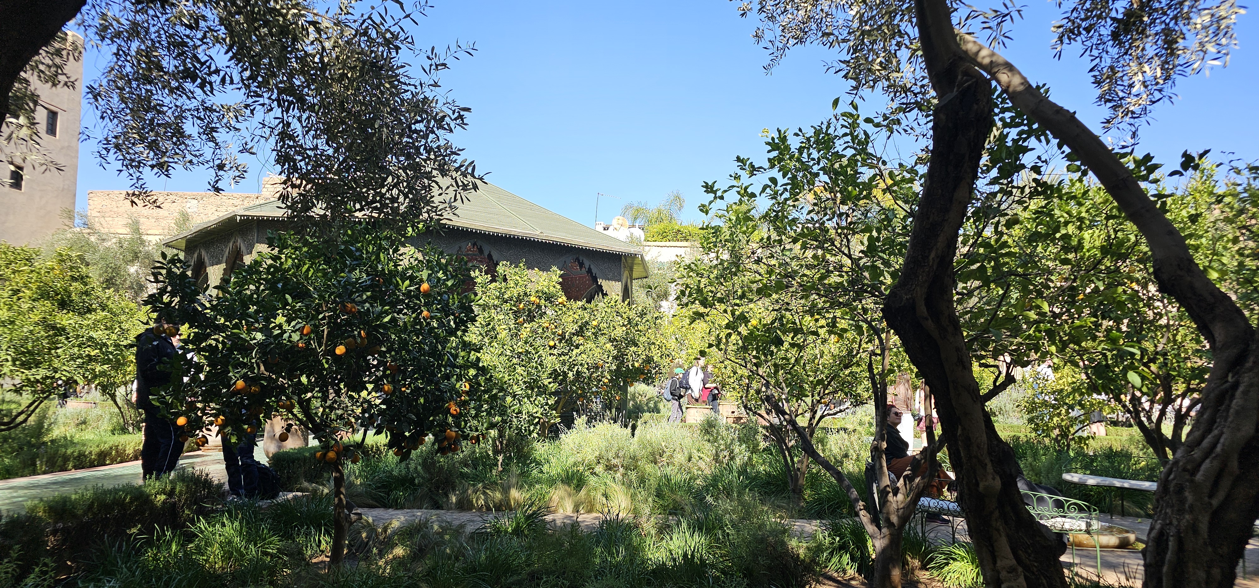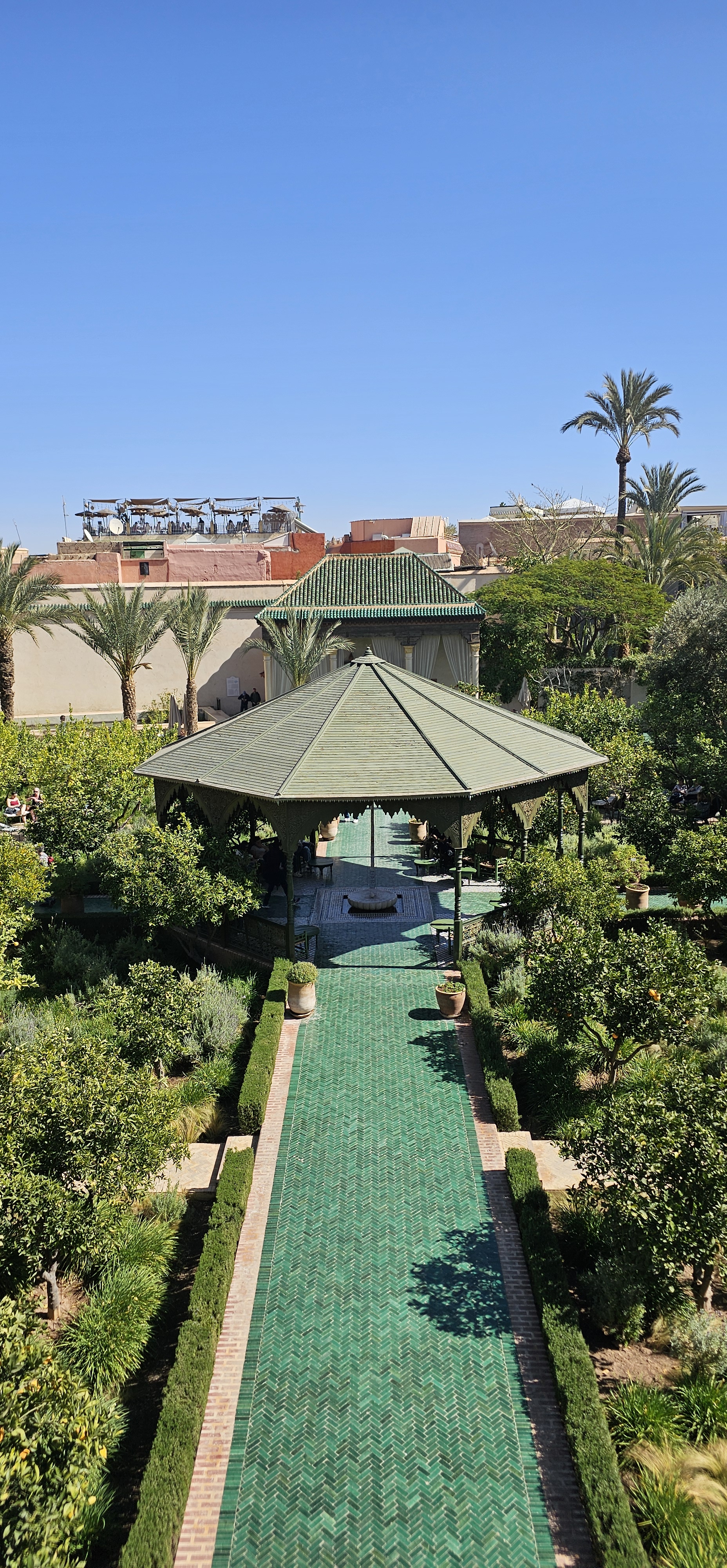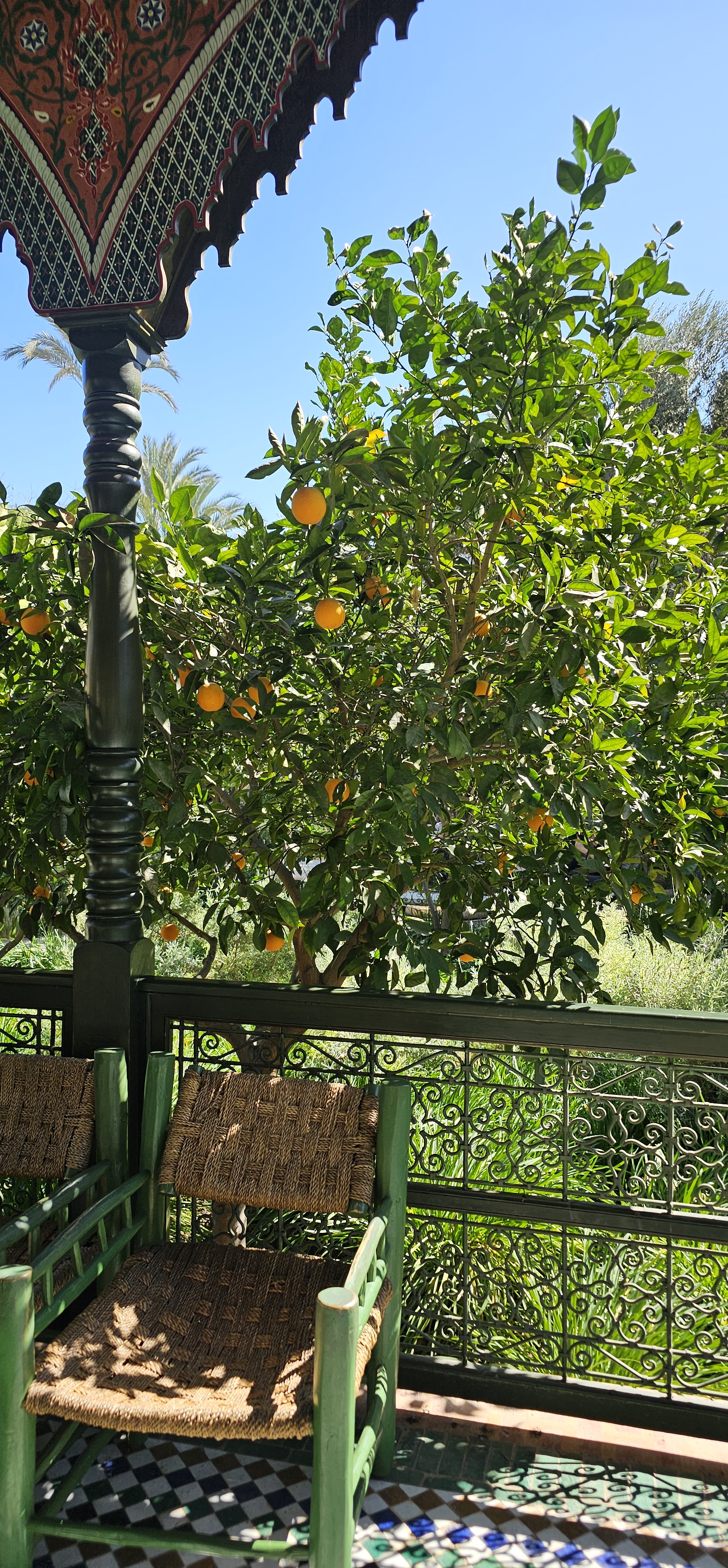 But it’s the main garden that steals the show. The central courtyard boasts a lovely canopy, while paths are lined with blooming orange trees, filling the air with a fresh, citrus scent. Follow the flowing stream of water to trace its journey from the nearby Atlas Mountains, as it winds through this beautiful oasis. Don’t miss the terrace at the far side—offering an elevated view that takes in the entire garden and the iconic rooftops of Marrakech’s Red City.