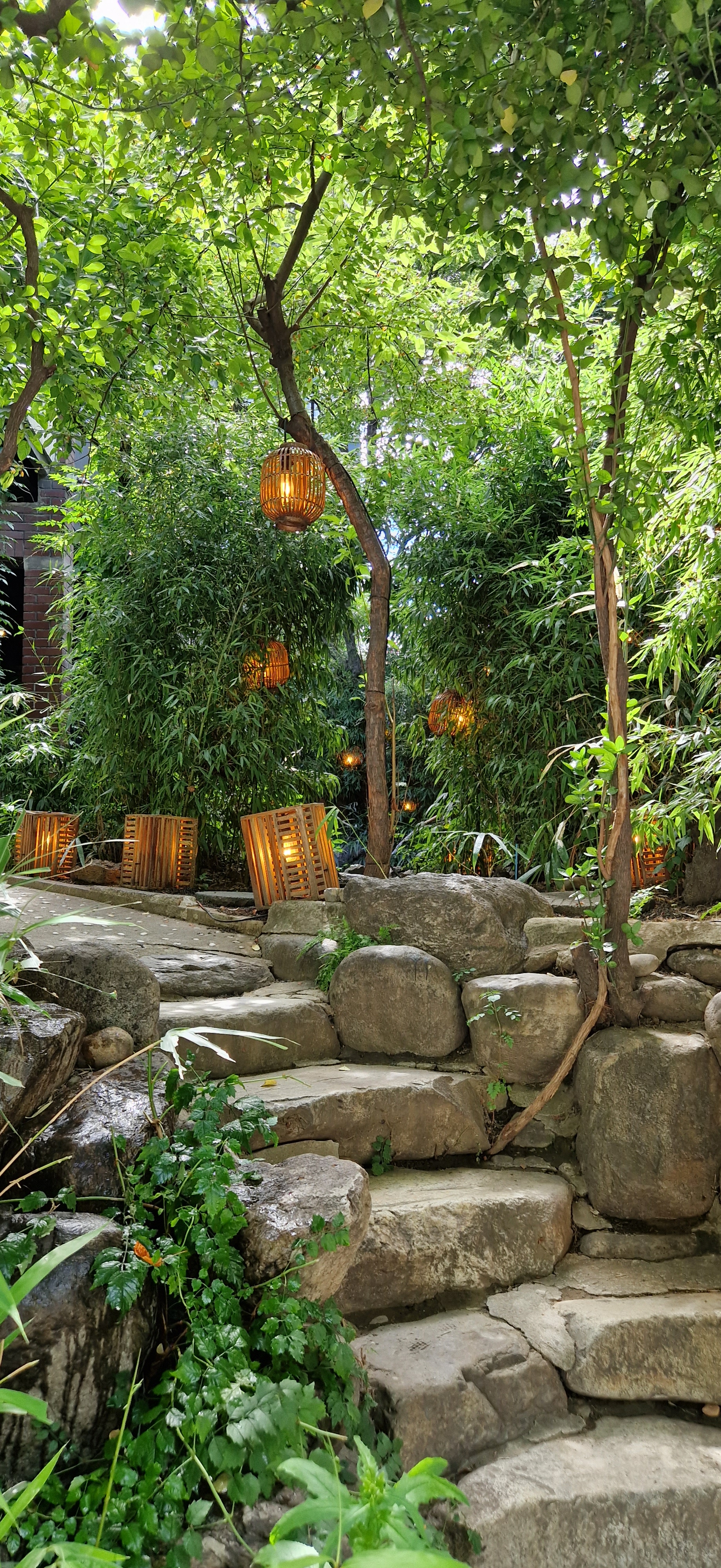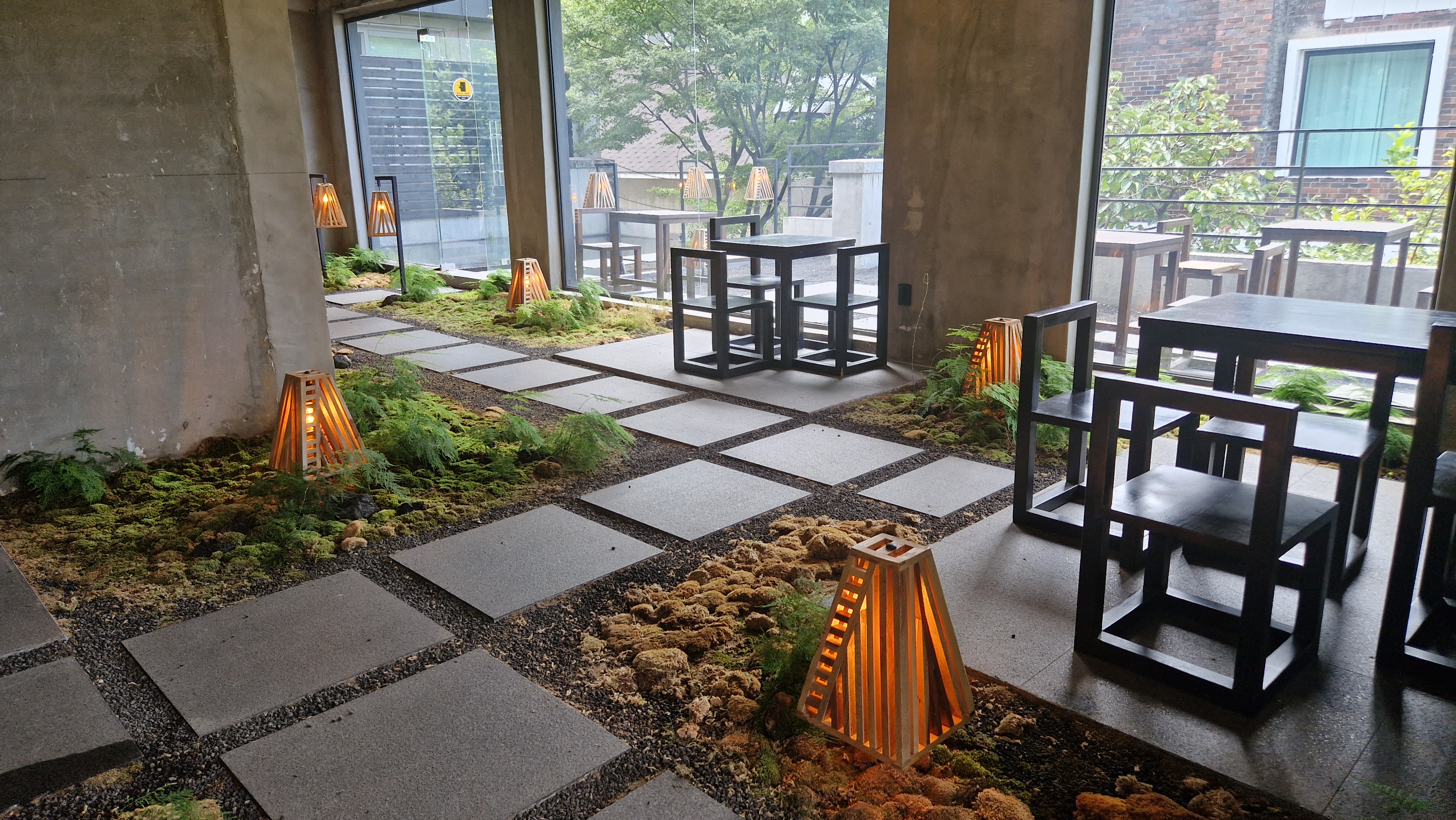 The interior is a stunning blend of traditional Korean wooden architecture and serene ambiance, with a calming waterfall feature adding to its charm. The lower floors offer cozy, floor-seating arrangements, perfect for a peaceful retreat. Meanwhile, the upper floor has a more modern touch, with a garden-like setting that feels just as inviting.