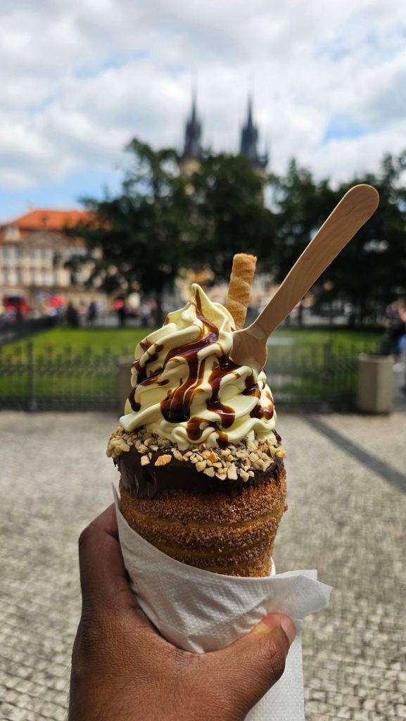 While walking around, I tried Trdelník, also known as Chimney Cake. This sweet dough cone filled with soft-serve ice cream was absolutely delicious and completely new to me. If you’re a foodie in Prague, this treat is a must-try.