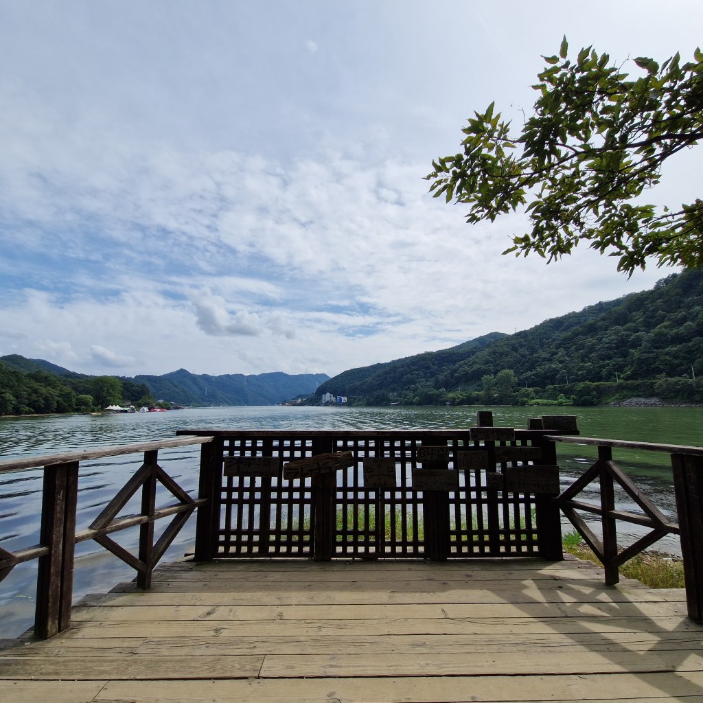 We followed the path down to the southern coast of the island before continuing along to the far eastern tip of the ‘half moon,’ where we reached Changgyeongwon Platform. From there, the panoramic views of the river and valleys on either side were absolutely stunning, well worth the walk to the far side.